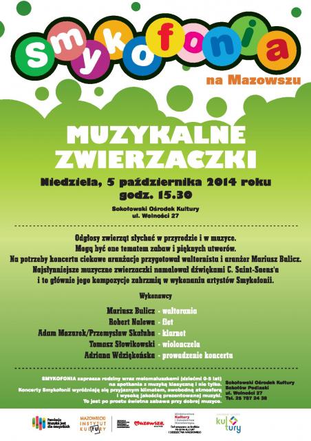 Na potrzeby koncertu ciekawe aranżacje przygotował waltornista i aranżer Mariusz Bulicz. Najsłynniejsze muzyczne zwierzaczki namalował dźwiękami C. Saint-Saens'a i to głównie jego kompozycje zabrzmią w wykonaniu artystów Smykofonii.