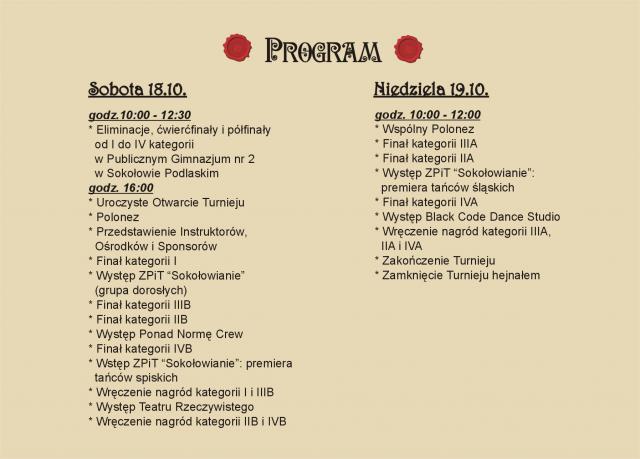 Eliminacje par turniejowych kategorii A i B w sobotę 18 października o godz. 10:00 w hali sportowej Publicznego Gimnazjum nr 2 w Sokołowie Podlaskim. Uroczyste otwarcie Turnieju nastąpi o godz. 16:00 tego samego dnia.