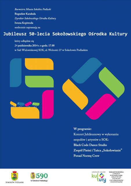Burmistrz Miasta Sokołów Podlaski Bogusław Karakula oraz Dyrektor SOK Iwona Kopiwoda serdecznie zapraszają na Jubileusz 50-lecia Sokołowskiego Ośrodka Kultury.