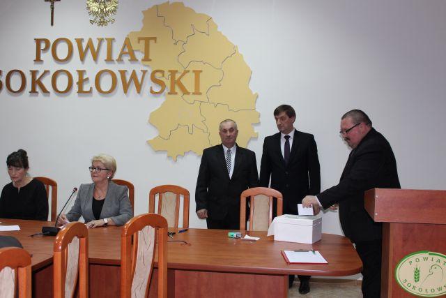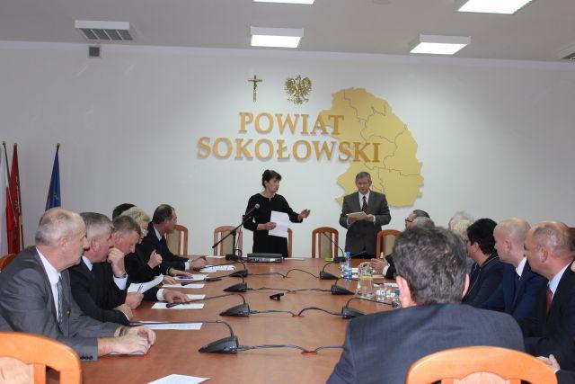 Samorządowcy złożyli ślubowanie i odebrali zaświadczenia o wyborze, po czym przystąpiono do wyboru przewodniczących, starostów i członków zarządu. W skład zarządu wchodzą Starosta Leszek Iwaniuk, Wicestarosta Marta Sosnowska, radny Jan Godlewski oraz radna Teresa Olszewska. Na przewodniczącego Rady Powiatu Sokołowskiego wybrano Jarosława Puściona a wiceprzewodniczącego Jerzego Strzałę. Na sesji nieobecny był radny Bogusław Karakula.