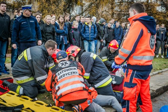 Aby jeszcze bardziej uświadomić zagrożenia panujące na drodze, policjanci wspólnie z przedstawicielami pozostałych służb ratowniczych przeprowadzili specjalny pokaz - symulację wypadku drogowego przy jednej z sokołowskich szkół średnich. Za miejsce została wybrana droga przy szkole, w której uczą się klasy mundurowe. Symulacja była zarazem rodzajem lekcji współdziałania służb na miejscu wypadku.
